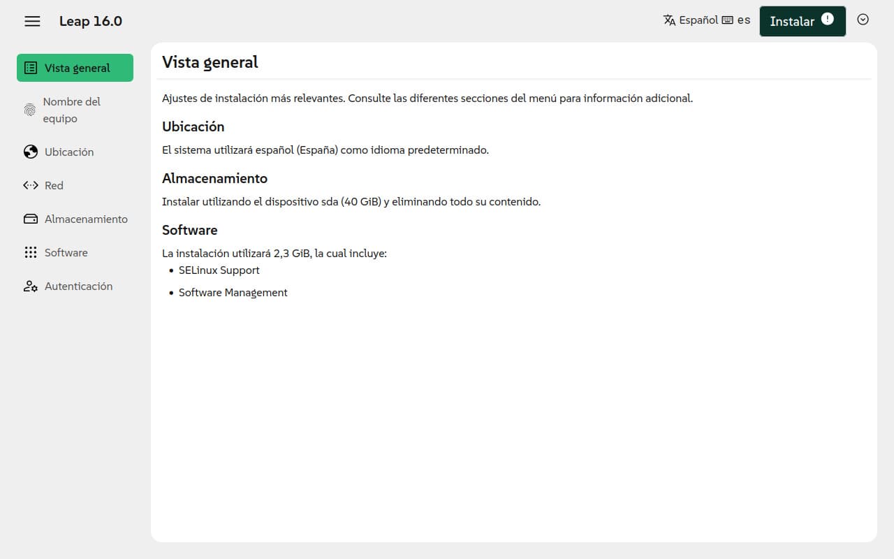 Hablando de instalación, es ahí donde primero se percibe la gran novedad de openSUSE Leap 16, y se trata de un cambio histórico: ha llegado el adiós a YaST, el veterano gestor del sistema. Así, para la instalación del sistema toma el relevo Agama, «un instalador basado en servicios» y desarrollado con tecnologías web cuya interfaz no es otra que Firefox. Agama cumple por ahora con lo mínimo en cuanto a funcionalidad y no está exento de errores, pero es lo que hay.