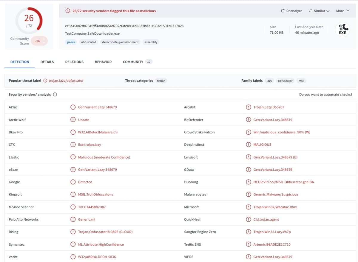 Aunque el incidente ha generado gran preocupación en la comunidad de Linux, todo apunta a que el ataque iba dirigido específicamente a usuarios de Windows. El ejecutable malicioso se instalaba en la carpeta AppData/Roaming (una ruta exclusiva de ese sistema operativo). El archivo, identificado también como “TestCompany.SafeDownloader.exe”, fue marcado como malicioso por 26 de los 72 proveedores de seguridad en VirusTotal.
