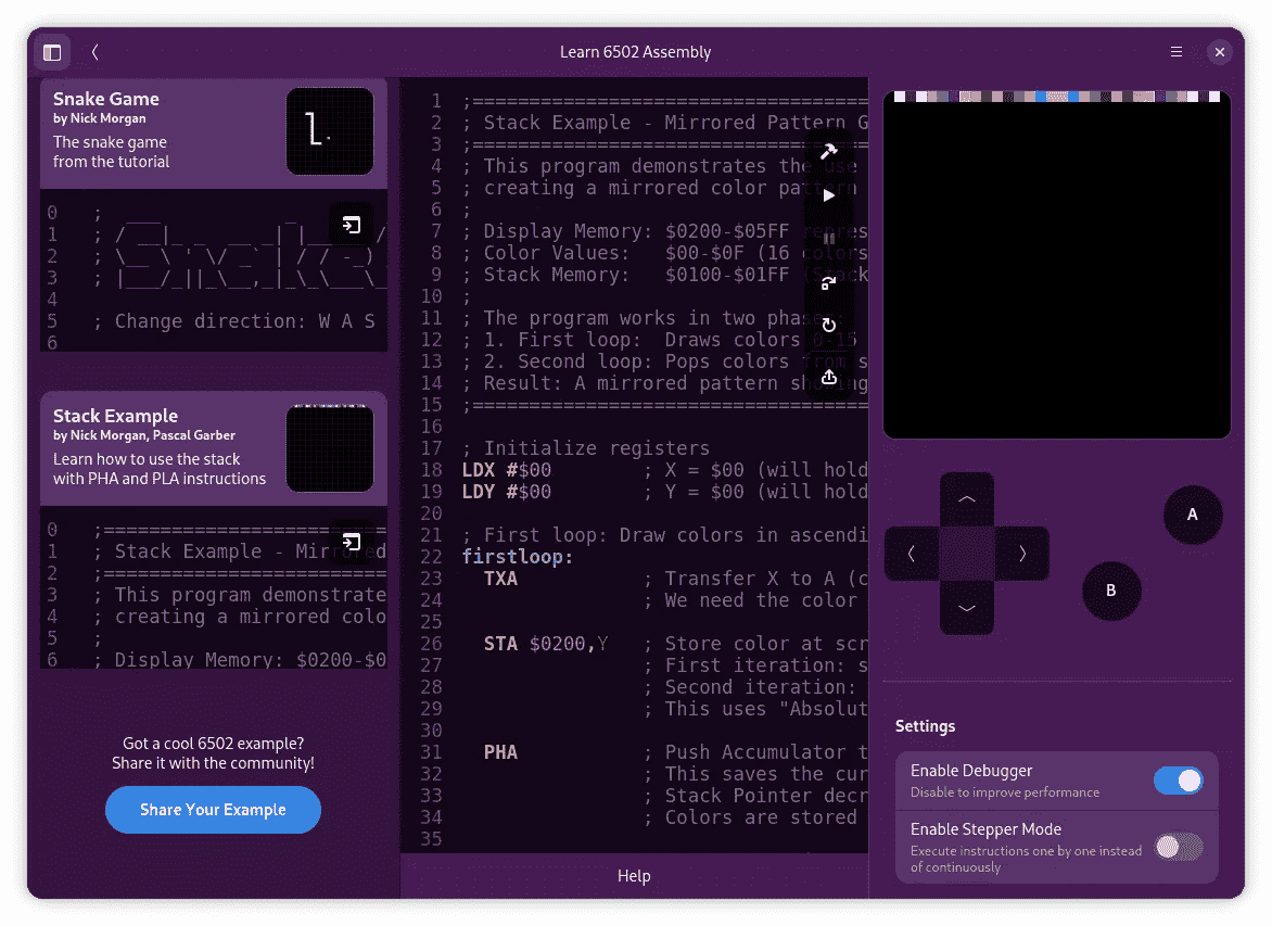 - Learn 6502 Assembly v0.6.0 ha sido lanzado. Esta actualización añade una nueva sección de Ejemplos con programas de ensamblador 6502 listos para ejecutar, incluidos Snake y un ejemplo de Pila. Ahora incluso es posible compartir ejemplos propios de código directamente desde la aplicación, lo que abrirá automáticamente una solicitud de extracción en GitHub.