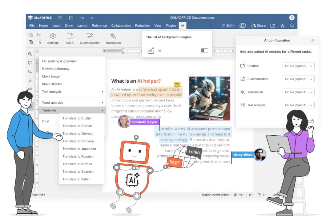 En ONLYOFFICE Docs no echarás de menos a tu asistente de inteligencia artificial favorito: ChatGPT, Mistral, DeepSeek… Usa el que desees para chatear, generar y reescribir textos, realizar resúmenes y traducciones o generar imágenes, entre otras tareas. Más información.