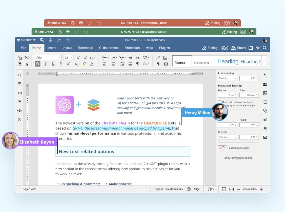 El trabajo en equipo es fundamental hoy en día y muestra de ello es la posición dominante de soluciones como Google Docs y Microsoft 365. Nacida expresamente con dicho propósito, ONLYOFFICE Docs es la alternativa de código abierto más robusta y avanzada en este escenario: permite la edición simultánea de documentos con diferentes niveles de permisos, comentarios, historial de versiones y chat integrado.