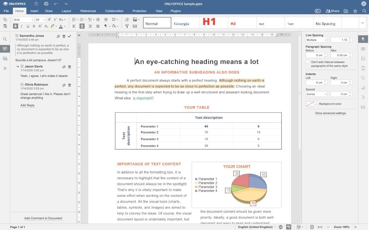 El procesador de textos de ONLYOFFICE no solo abre, edita y guarda documentos con formato DOCX casi a la perfección, sino que además ofrece herramientas avanzadas para gestionar textos largos, referencias bibliográficas, índices automáticos y control de cambios, algo esencial para trabajos colaborativos o académicos. Todo esto acompañado de una interfaz limpia y familiar, que recuerda en gran medida al estándar impuesto por Microsoft Word, reduciendo así la curva de aprendizaje.