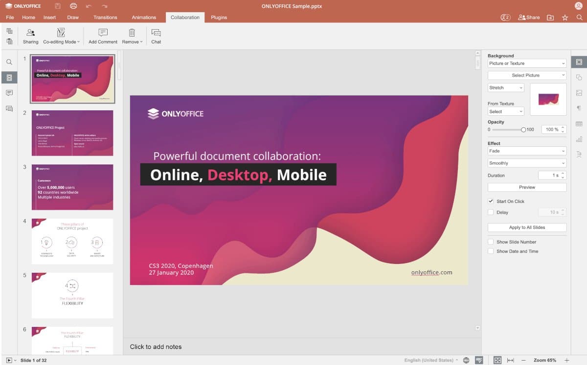Crear presentaciones visuales y dinámicas también es sencillo gracias al editor de presentaciones, que además de manejar archivos PPTX con soltura, ofrece una buena variedad de transiciones, efectos visuales y herramientas para incrustar elementos multimedia. Como es habitual en ONLYOFFICE, la interfaz es amigable y la curva de aprendizaje mínima, permitiendo al usuario enfocarse en el contenido más que en el software.