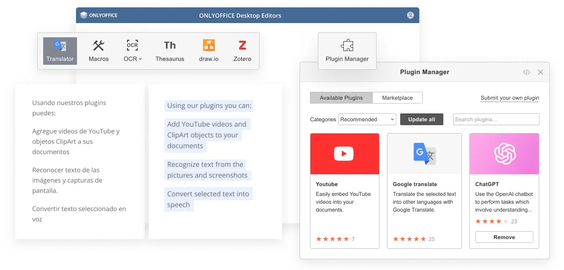 Otro punto fuerte de ONLYOFFICE Desktop Editors es su extensibilidad a través de plugins. Esto abre un mundo de posibilidades prácticamente ilimitado: desde traductores automáticos hasta gestores bibliográficos o asistentes de IA capaces de resumir documentos, generar texto o asistir en cálculos complejos, compatibles con modelos y proveedores de IA locales, tales como Ollama y GPT4ALL. La instalación de estos plugins es sencilla y se gestiona desde una sección específica en el menú de cada aplicación, donde es posible encontrar plugins oficiales y de terceros para añadir funcionalidades específicas según las necesidades del usuario.
