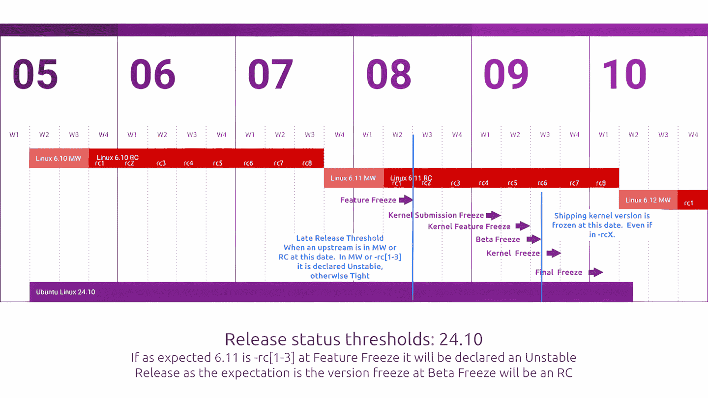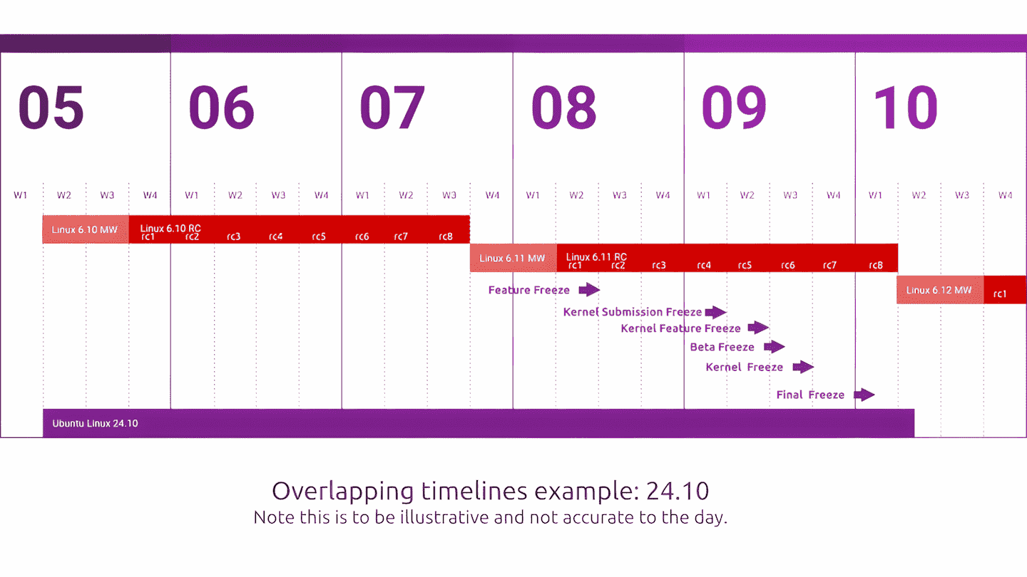 Lo planteado por el CKT puede ser un problema cuando una nueva versión de Linux es lanzada solo cuatro semanas antes de una nueva publicación de Ubuntu o una semanas después de la fecha programada para el sistema operativo. Para ilustrar la situación con un ejemplo, el equipo ha publicado un gráfico en el que se ve que el lanzamiento de Ubuntu 24.10 casi coincide con el de Linux 6.11.