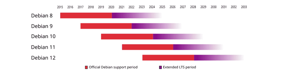 Sin embargo, con la introducción de los programas LTS y Extended LTS en Debian se ha solucionado este problema, extendiendo el soporte para Debian hasta un total de 10 años desde su lanzamiento. En comparación, otras distribuciones empresariales ofrecen diferentes duraciones de soporte: SUSE Linux Enterprise Server brinda hasta 19 años, Red Hat Enterprise Linux ofrece 14 años (10 años más 4 años de soporte adicional pago), Ubuntu llega a 12 años (5 años más 7 años de soporte adicional pago), openSUSE se mantiene por 18 meses, y Fedora Linux tiene un ciclo de 13 meses.