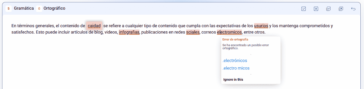 Corrector Castellano es una de las herramientas líderes en cuanto a programas basados en IA para escritores españoles. Como indica el título de la herramienta, es una herramienta correctora y puede solucionar cualquier problema con el contenido, es decir, errores gramaticales, ortográficos, de puntuación o acentuaciones faltantes.