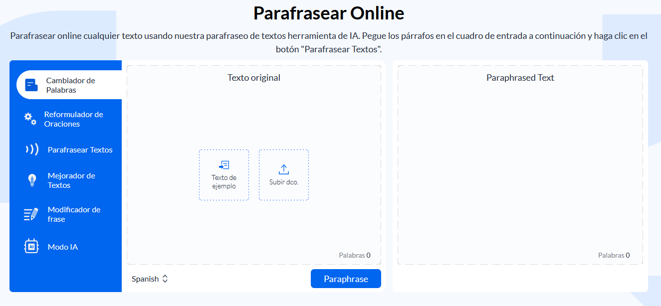 Paraphrase Online es una herramienta tan sencilla de utilizar como su nombre indica. Es un parafraseador en línea que permite a los usuarios reformular su contenido de manera bastante conveniente. Y como se especializa en el idioma español, es el mejor que los escritores españoles pueden usar para esto.