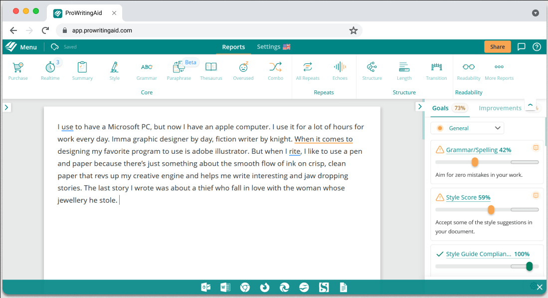 ProWritingAid es otra herramienta que puede ayudar a escritores en varios idiomas, incluido el español. Tiene muchas características, pero quizás la razón por la que está en esta lista sea por su capacidad para mejorar la fluidez. Y tiene un buen conocimiento del idioma español.