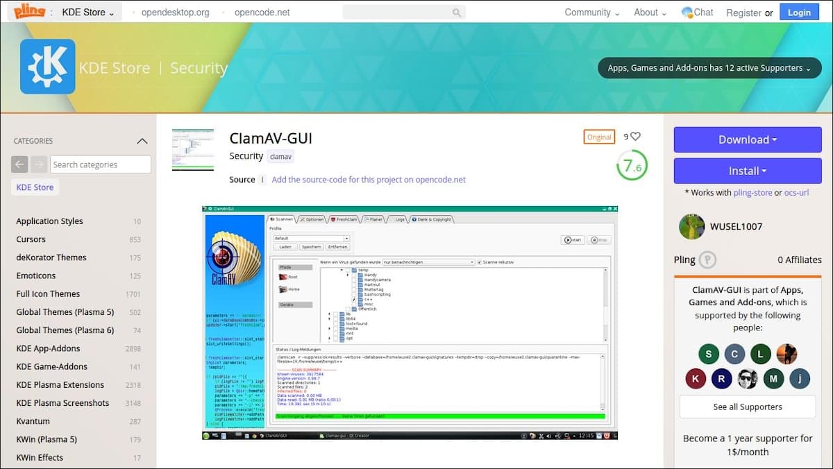 O de esta poco conocida y novel app llamada ClamAV-GUI Antivirus, la cual, es descrita brevemente por su desarrollador como un Front-End para ClamAV. Y además, se encuentra disponible en su sitio web oficial sobre OpenCode y la KDE Store de Pling, y requiere de la previa instalación de los paquetes «clamav» y «clamav-freshclam» para funcionar.