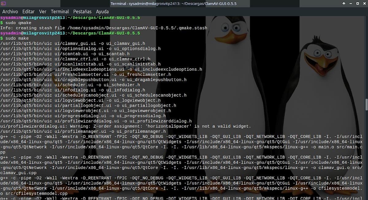 - Luego compilamos el paquete con las órdenes de comando: «sudo qmake», «sudo make» y «sudo make install».