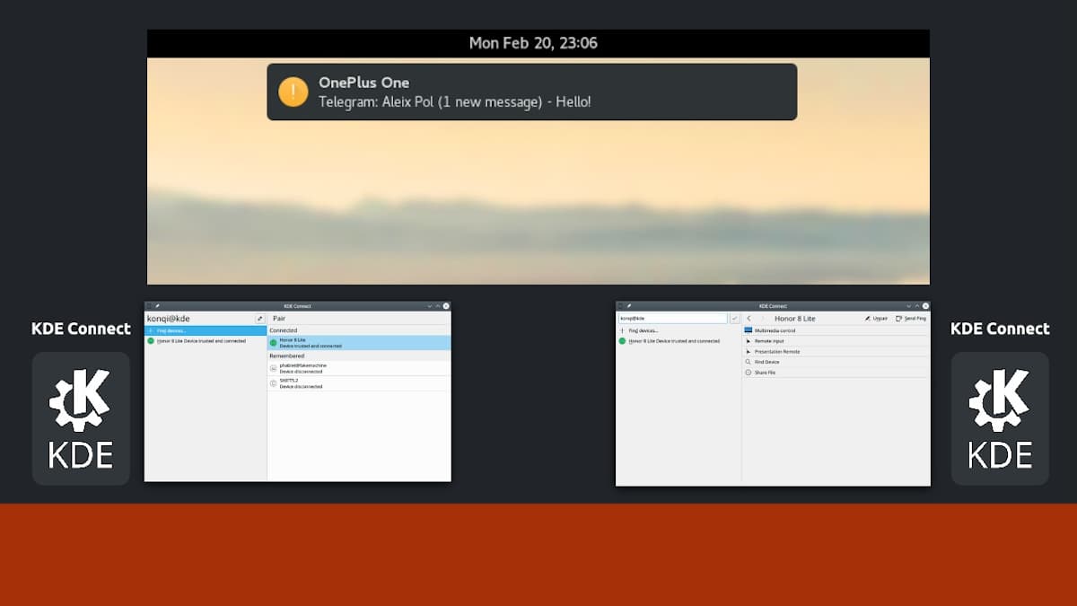 KDE Connect es una excelente herramienta de software multiplataforma que proporciona varias funcionalidades para integrar un teléfono y un ordenador. Además, nos permite enviar archivos a otros dispositivos, controlar la reproducción de medios, enviar entrada remota, ver sus notificaciones y muchas cosas más. Por lo tanto, es un fabuloso utilitario ofimático que le facilita a los usuarios del hogar y la oficina, el poder centralizar sobre cualquier ordenador sus diversos dispositivos móviles. Ya que, está diseñado para integrarse correctamente con el sistema operativo, dentro o fuera de KDE Plasma, permitiendo así el poder compartir archivos de las diferentes aplicaciones o integrándose con el sistema de notificaciones para mostrar información.