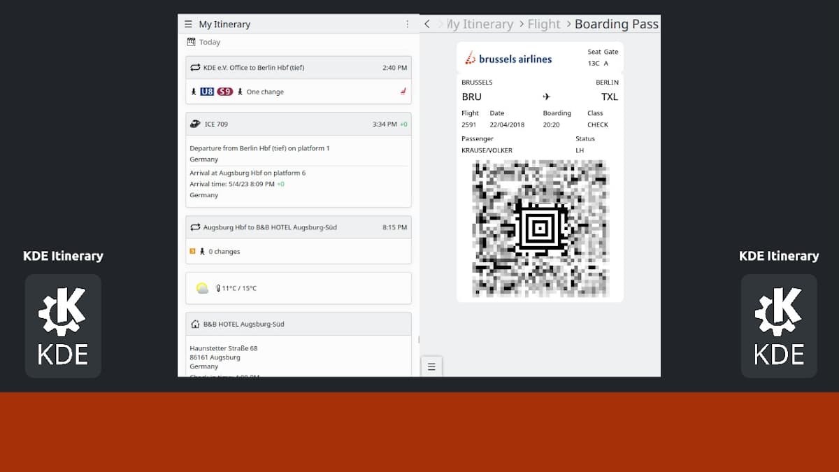 KDE Itinerary es un genial programa enfocado a servir como asistente de viajes digital con énfasis en la protección de la privacidad de los usuarios. Y para ello, incluye idóneas funciones como: Una vista cronológica para cualquier itinerario de viaje unificado con agrupación de viajes automática; la posibilidad de gestionar el uso de reservas de trenes, autobuses y vuelos, así como de hoteles, restaurantes, eventos y alquiler de automóviles; y llevar la gestión de las necesarias tarjetas de embarque, billetes de reservas de varios viajeros, y de las útiles estadísticas de viaje personales. Además, KDE Itinerary funciona mejor con el complemento de extracción de itinerarios de KMail y con KDE Connect, o con Nextcloud Hub y DavDroid.