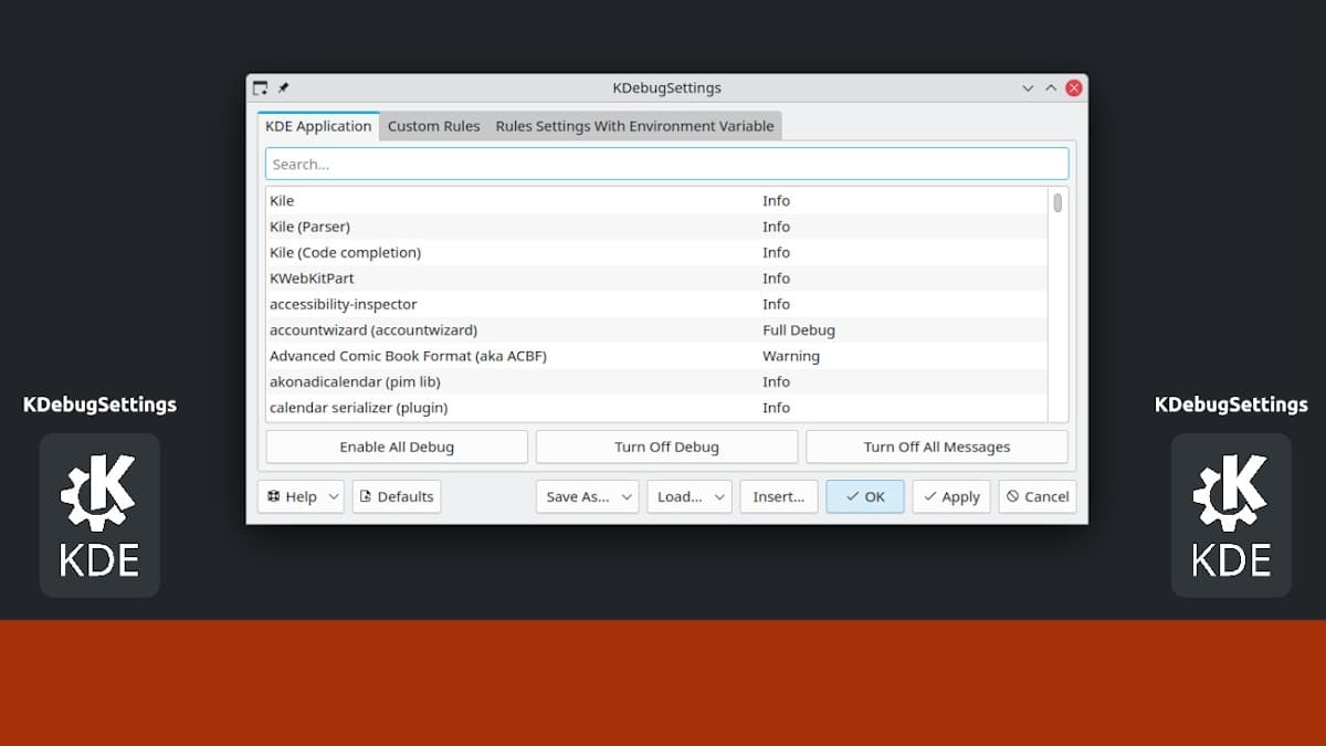 KDebugSettings es un utilitario de software de KDE Plasma permite gestionar las preferencias de KDebug visibles y relacionadas con QLoggingCategory. De esta forma, es posible hacer que QLoggingCategory muestre los mensajes de las apps en la consola gráfica sobre el escritorio. Y en consecuencia, sea fácil el explorar los mensajes asociados a las aplicaciones, que suelen contener informaciones, advertencias o errores críticos, que suelen ser útiles para ayudarnos a depurar aplicaciones Qt. Por último, y para un mejor y mayor entendimiento y uso de esta herramienta, se cuenta con su manual en línea, al cual puede accederse a través del siguiente enlace.
