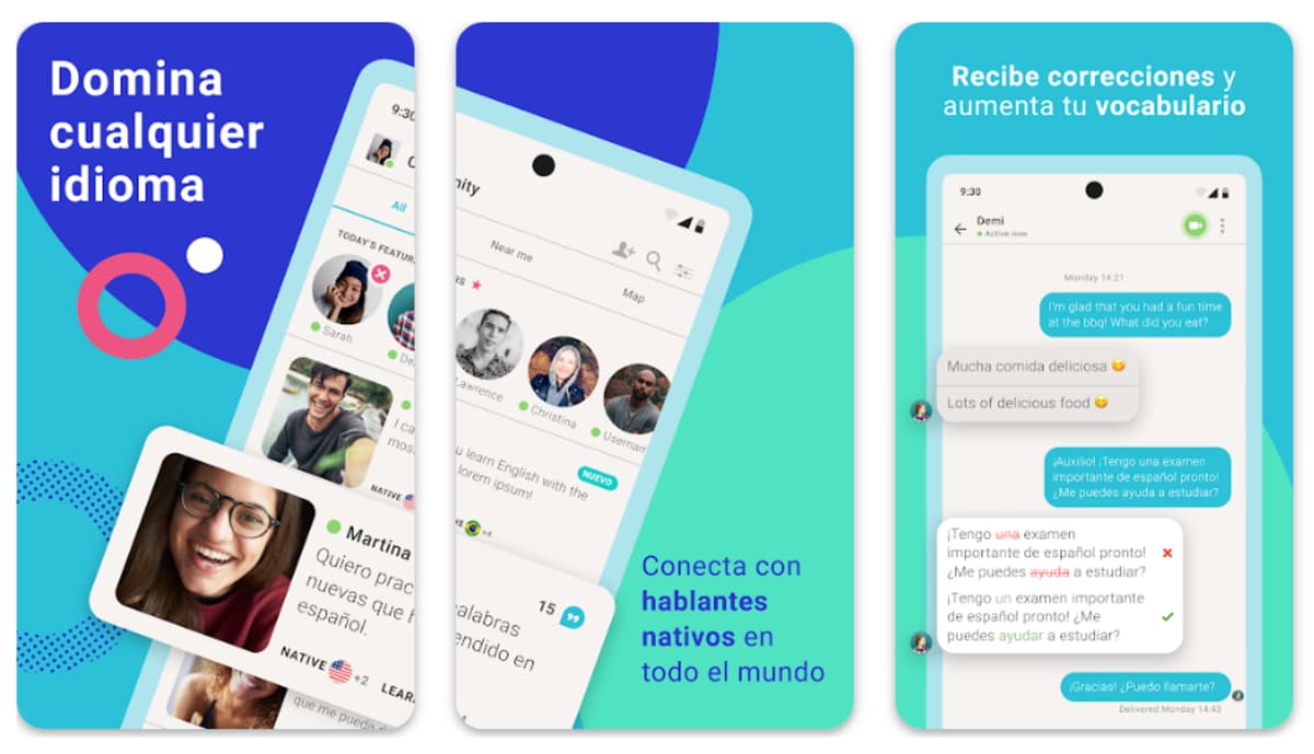 Tandem ofrece un espacio donde tanto estudiantes como profesores se reúnen para crear una comunidad dispuesta a aprender idiomas e intercambiar conocimientos. Pero además de apoyarte en una comunidad dispuesta a facilitarte el camino de conocer un nuevo idioma, también lo hace la inteligencia artificial que tiene integrada.