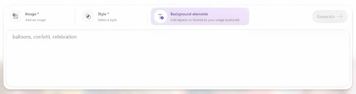 - Background elements. Esta última opción nos permite, si queremos, añadir elementos de fondo a la imagen que hemos subido. Si no introducimos ninguna palabra, Microsoft Desginer adaptará el fondo de la imagen al estilo que previamente hemos seleccionado.