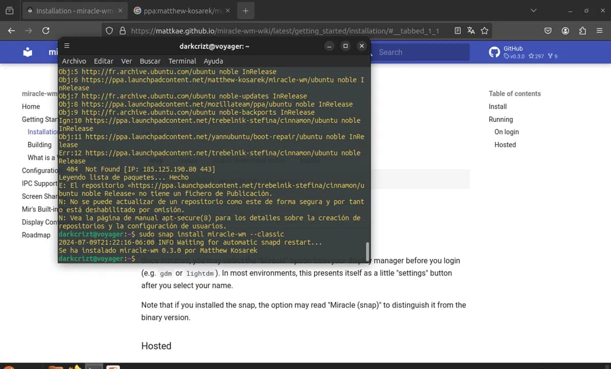 Ahora, el segundo método de instalación de Miracle-wm en Ubuntu o algún derivado, es añadiendo el repositorio al sistema y realizando la instalación de los paquetes de este repo. Cabe aclarar que para poder instalar Miracle-wm con este método debes de estar sobre Ubuntu mantic (23.10) o Noble (24.04), aunque en el último caso no me fue funcional, ya que el repositorio no aparecía disponible.