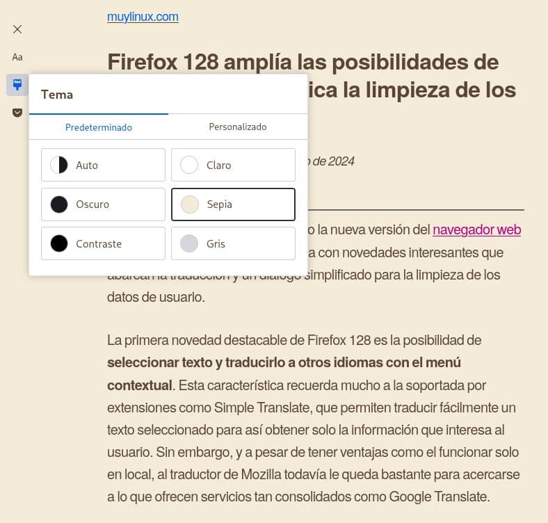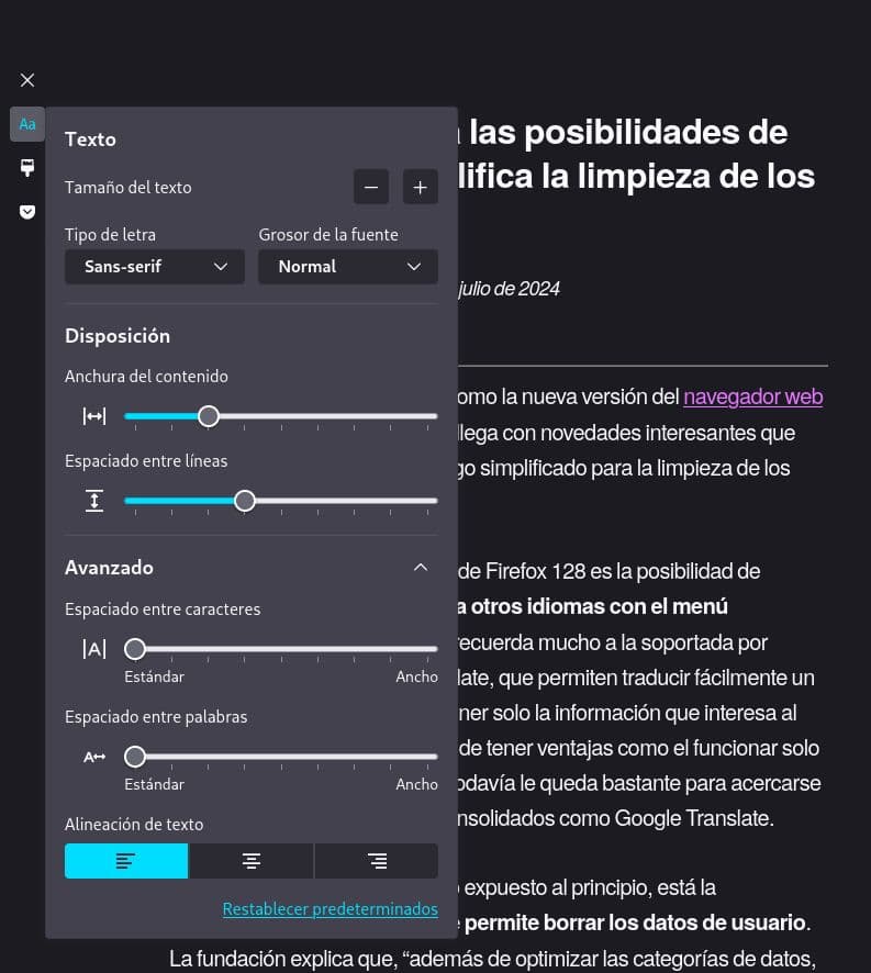 Lo primero que ha destacado Mozilla de Firefox 129 es que la vista de lectura ha introducido dos menús: “Texto y disposición” y Tema. El primero permite cambiar la fuente tipográfica, el grosor de la fuente tipográfica, el tamaño del texto, la anchura del contenido, el espaciado entre líneas, el espaciado entre caracteres, el espaciado entre palabras y la alineación del texto, mientras que el segundo, como bien indica su nombre, sirve para establecer un tema estético, el cual puede ser uno de los ofrecidos de manera predeterminada o creado por el propio usuario. Todo esto va dirigido a que el usuario pueda personalizar la experiencia con la vista de lectura con el fin de mejorarla (o eso se supone).