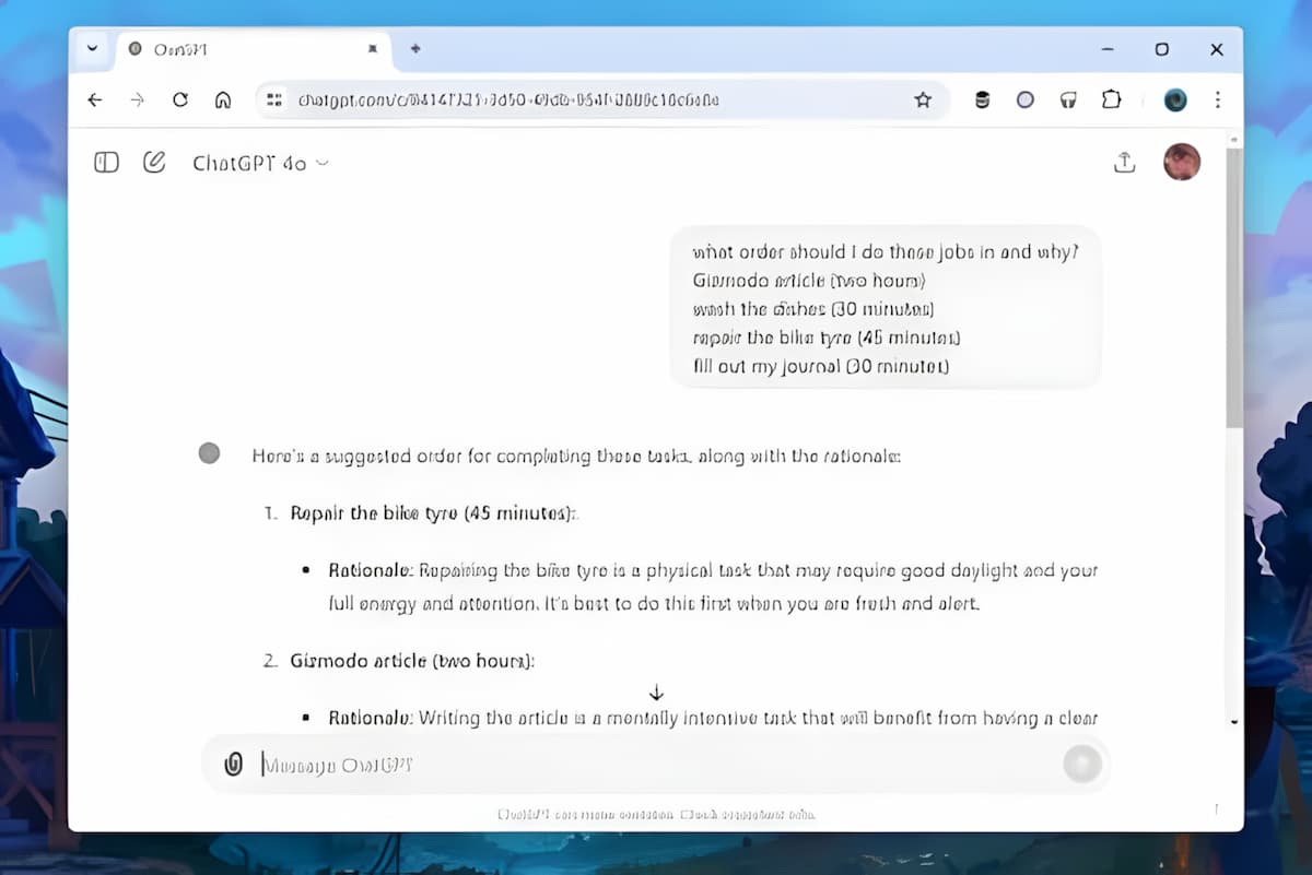 Otra opción es pedirle a ChatGPT que planifique tu tiempo. Esto funciona mejor cuando eres más específico; de lo contrario, solo obtendrás mucho texto genérico de IA, como «prioriza tus tareas» y «limita las distracciones». Si quieres que el chatbot sea lo más útil posible, cuéntale sobre tu plan.