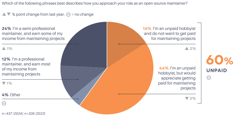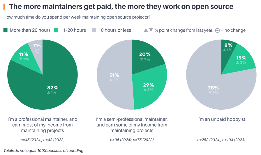 A la pregunta de si los mantenedores de código abierto son pagados por su trabajo, el 60% dijo que no, con un 16% que respondió “soy un aficionado no remunerado y no quiero que me paguen por mantener proyectos” y un 44% que confesó ser “un aficionado no remunerado”, pero que agradecería que le pagaran por mantener proyectos. Un 24% dijo que era un mantenedor semiprofesional que ganaba algún dinero manteniendo proyectos y un 12% que eran profesionales cuyo ingreso principal es el mantenimiento de proyectos.