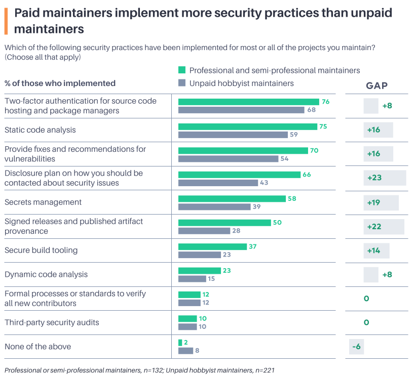 Los mayores medios con los que suelen contar los mantenedores remunerados les permite, según los resultados publicados en el informe de Tidelift, implementar más prácticas de seguridad que los no remunerados. La medida de seguridad más implementada en ambos casos es la autenticación en dos factores, la cual está seguida por el análisis de código estático, la proporción de correcciones y recomendaciones para vulnerabilidades, el plan de divulgación sobre cómo se debe contactar en torno a los problemas de seguridad y la gestión de secretos.