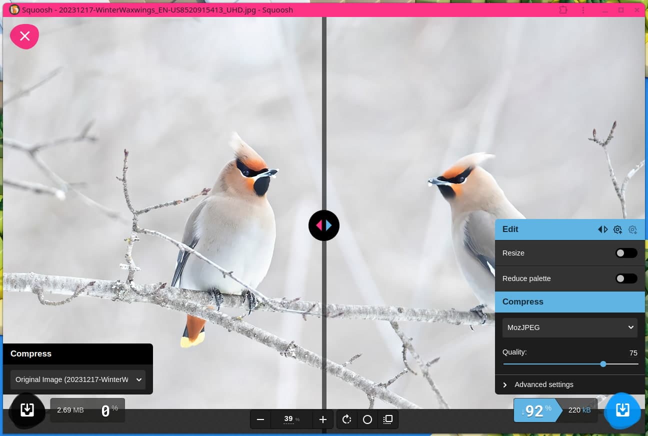 Sin embargo, si se trata de afinar con una imagen, prefiero Squoosh por el tipo de interfaz que ofrece. En ambos casos se trata de software de código abierto y a modo de aplicación web, aunque Squoosh lo es al cien por cien. Pero no tengas reparos, porque todas las operaciones se realizan en local; la conexión se precisa para enviar los datos básicos al visitar cualquier sitio web, el porcentaje de compresión obtenido y el tipo de instalación (si es PWA, por ejemplo).