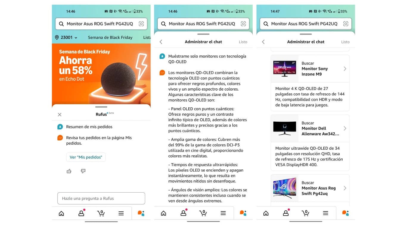 Un ejemplo: le he solicitado a Rufus una lista de monitores que se venden en Amazon con tecnología QD-OLED. Si bien ha habido unos cuantos que sí contaban con esta tecnología, había otros tantos productos que contaban con panel W-OLED, o incluso paneles LCD con retroiluminación FALD. Si bien considero que es difícil conseguir una lista con especificaciones muy concretas porque en la base de datos de cada producto en Amazon suele haber datos que bailan un poco, sí creo que puede ser una de las consultas más útiles que hacerle a esta IA, ya que además de explicarte en detalle cualquier duda sobre un dato concreto, también te ofrece un listado con los productos.