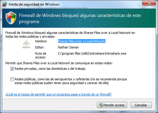 Una vez hayas instalado este programa en Windows, recuerda quitar las restricción del firewall, luego de podras compartir archivos por medio del menu de nitroshare.