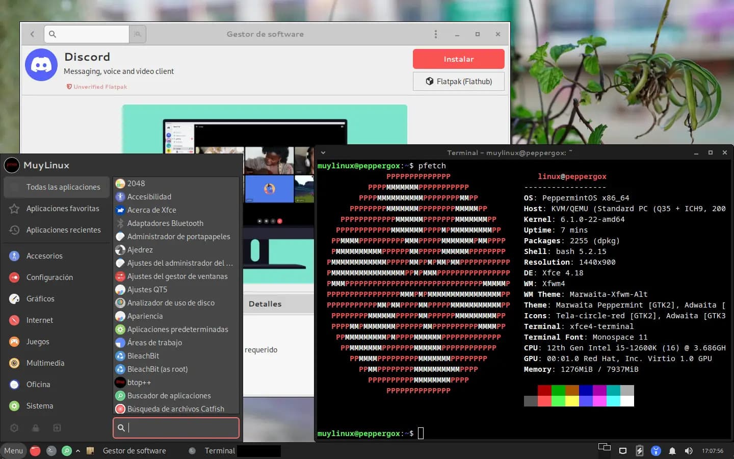 Continuando con más software que uno puede encontrarse en Peppermint OS Loaded, están Btop++, que es un potente monitor de procesos reemplaza a Htop y ofrece una interfaz más informativa y visualmente atractiva; xDaily o xDiario, una interfaz gráfica de usuario que ayuda al mantenimiento del sistema operativo; y pfetch, que es un reemplazo personalizado del descontinuado Neofetch y es una herramienta que proporciona información básica del sistema.