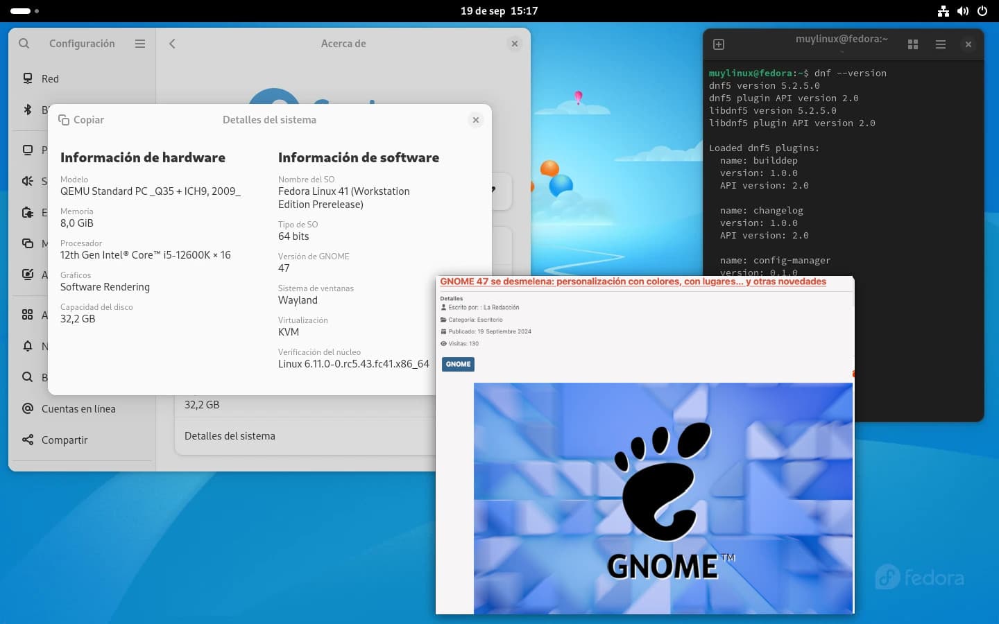 Fedora 41 no promete aparentemente más revoluciones, pero, como es tradición en la distribución, vendrá con software bastante reciente. A nivel de escritorio nos encontramos con la presencia de GNOME 47 en Workstation y Silverblue, mientras que KDE Plasma 6.1 hará acto de presencia en el spin con KDE y en Kinoite. Un detalle importante es que Workstation y Silverblue han dejado de preinstalar la sesión de Xorg, la cual tendrá que ser instalada a través de DNF o rpm-ostree, dependiendo del caso.