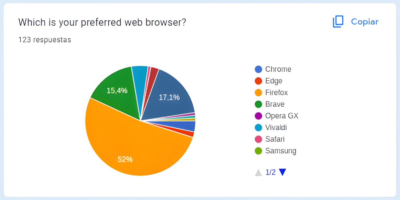 ¿Y en cuanto a navegador web y entorno de escritorio? En este punto sí se parecen muchos las cosas a lo que han respondido nuestros lectores y Firefox gana de calle lo que le toca, con un porcentaje (57,9%) bastante más holgado. Lo curioso del asunto es que la opción más votada después de Firefox no es nada que venga de Chromium, sino «otros navegadores basados en Firefox», sin especificar, pero con un 17,1% del pastel. Lejos se encuentra Brave (9,7%) y Chrome (5,4%) como alternativas más populares.