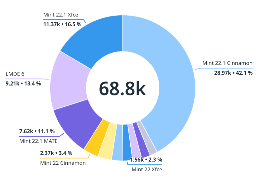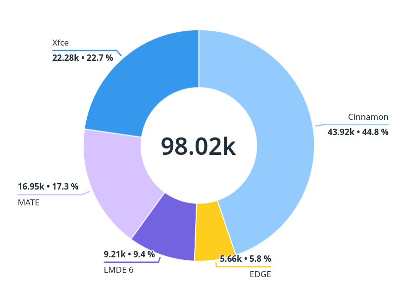 «Cinnamon representa el 60% de nuestras descargas, seguida de Xfce y MATE con aproximadamente el 20% cada una«, explican. Vale repetir asimismo que todos estos datos reflejan las descargas (y solo de la última semana) y no el uso, aunque se puede extrapolar, careciendo de indicadores más fidedignos. Al menos, para divagar un poco.
