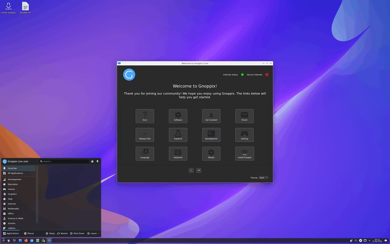 - Novedades destacadas: Esta nueva versión del año 2025, llamada 25-10 del proyecto de generación de Distribuciones libres y abiertas, llamado Gnoppix AI Linux, ahora incluye entre muchas novedades las siguientes: El empleo de la nueva versión estable Debian (13/Trixie) como base del sistema operativo, lo que mejora su enfoque y capacidades relacionadas con el rendimiento y la privacidad, a la vez que introduce una importante mejora en la experiencia de usuario y nuevas funciones para la comunidad. Sin embargo, a más detalles y a nivel de juegos y rendimiento, incluye una solución de forma integral al problema de la necesidad de realizar ajustes manuales para un rendimiento óptimo. También, incluye parches de rendimiento integrados directamente en el sistema operativo, por lo que ya no es necesario instalar ni aplicar manualmente estas correcciones críticas. Y en general, la experiencia de juego ha sido mejorada, lo que ofrece una Distro Gamer significativamente mejor a la hora de disfrutar de los videojuegos, ya que por ejemplo, con Steam y Lutris, muchos juegos de Windows ahora funcionan excepcionalmente bien, e incluso algunos títulos funcionan más rápido que en Windows. Por último, y entre muchas otras más, ofrece una renovada pantalla de bienvenida con un centro de control. Por lo que ahora, la misma ofrece una apariencia moderna, transformándola en un centro de control y comando central.