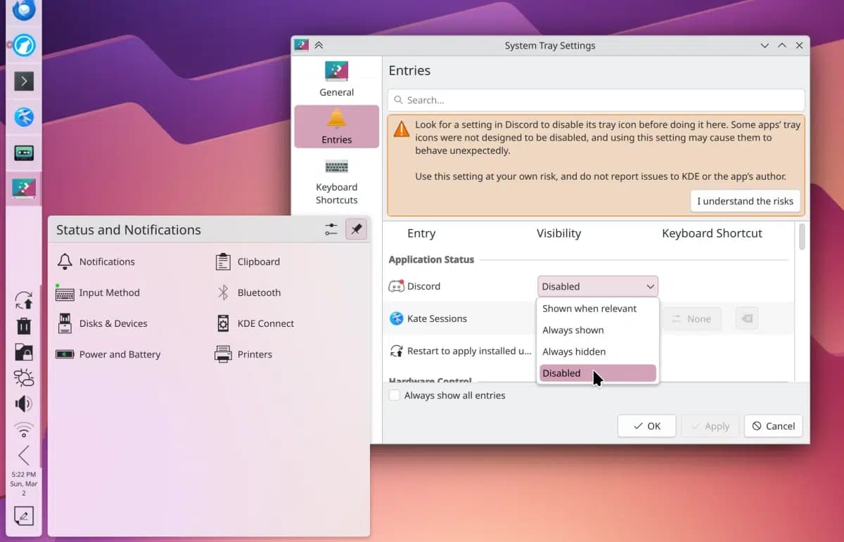 - Los widgets de Plasma en la bandeja del sistema que se ocultan completamente cuando no se consideran relevantes ya no lo hacen cuando se colocan de forma independiente en el panel.