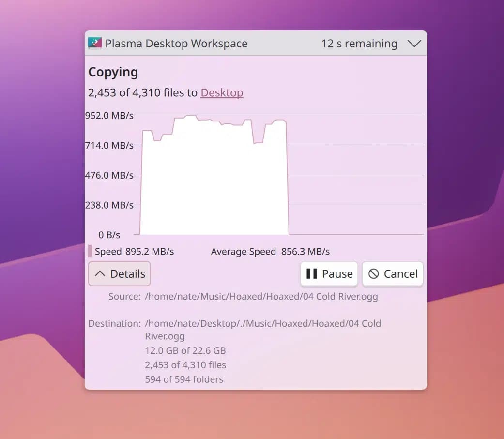 - Al hacer clic en el botón «Detalles» de una notificación del sistema que muestra el progreso de la transferencia de archivos, ahora se muestra un gráfico con la velocidad de transferencia a lo largo del tiempo.