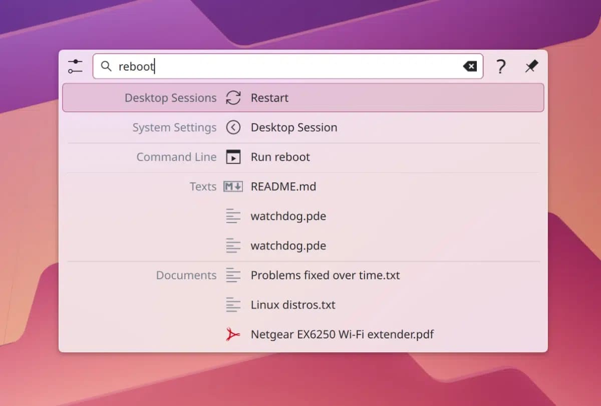 - Se ha mejorado la ordenación de los resultados de búsqueda de KRunner añadiendo las acciones de potencia y sesión al conjunto predeterminado de acciones favoritas, lo que garantiza que aparezcan en primer lugar cuando se busquen.
