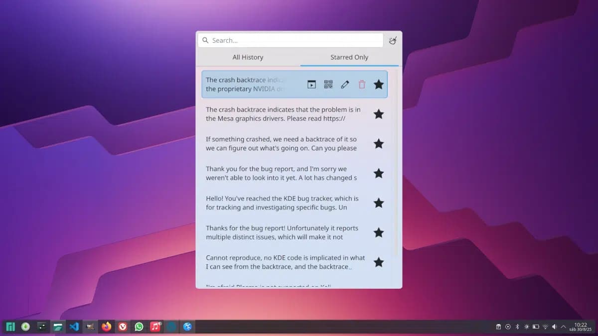 - El portapapeles de Plasma ahora permite marcar entradas como favoritas, y se guardarán permanentemente para que siempre podamos acceder a ellas fácilmente. Esto es muy útil cuando nos encontramos pegando los mismos fragmentos de texto comunes todo el tiempo. La solicitud de esta función tenía 22 años.