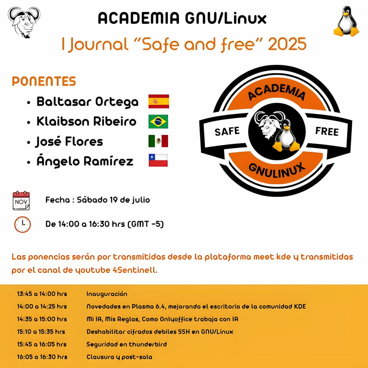 De esta forma os me complace compartir con vosotros que la Academia GNULinux os trae el I Journal «Safe and free» 2025, la cual constara de 4 ponencias de acuerdo al siguiente detalle: