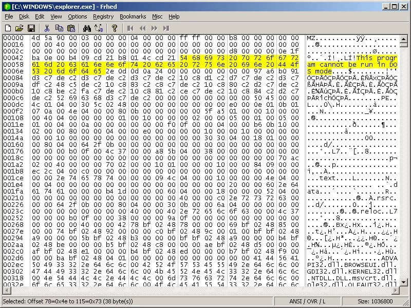 Aquí un editor hexadecimal mostrando el texto de uno de los mensajes de error de un archivo binario ('explorer.exe', para más señas)