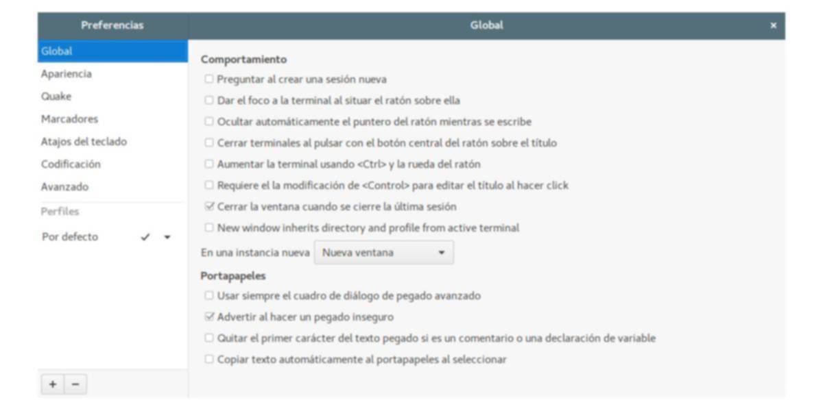 - Este terminal tipo mosaico dispone de un sistema de cambio automático de perfil que cuando cambiamos de usuario, directorio o de hostname, de forma automática se cambia el perfil que estés utilizando. Para activar o modificar esta característica, deberás modificarla en las preferencias, en la pestaña Avanzado del perfil en cuestión.