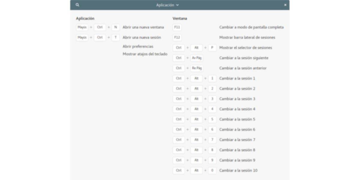 Hasta ese aspecto, está bien cuidado en Tilix. Este terminal tipo mosaico dispone de un cuadro de dialogo donde te muestran todos los atajos de teclados clasificados en cuatro secciones,