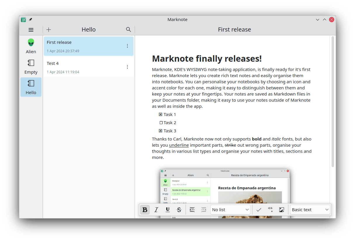 Marknote es una nueva aplicación del proyecto KDE, un, como su nombre indica, editor de Markdown, el popular lenguaje de marcado. Su lanzamiento fue anunciado hace ya una semana y desde entonces ha recibido un par de actualizaciones. Pese a ello, sigue estando tan verde que es imposible de recomendar… y sin embargo, vamos a dedicarle un hueco en estas páginas.