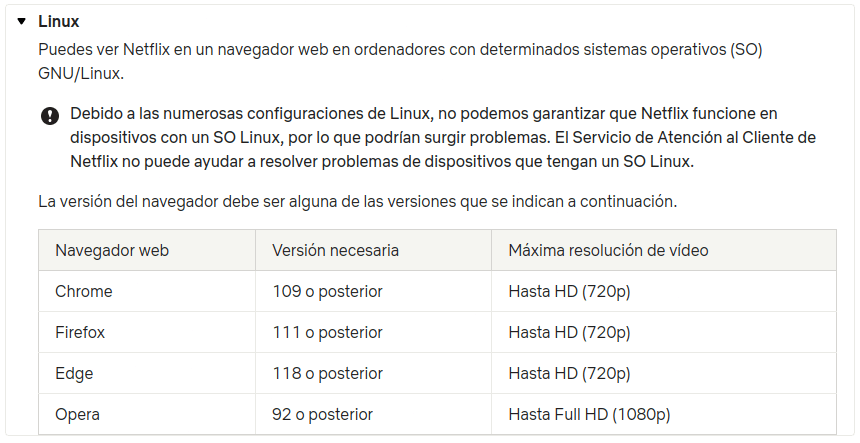 ¿Pero lo de Opera en Linux? Recordad: Opera cero, a menos que mucho haya cambiado de un año a esta parte (si es así, también agradeceré que algún comentario me lo comunique). Por lo demás, recuerdo yo que hace unos cuantos años había una extensión para ver Netflix a 1080p en Linux, pero pasó a mejor vida…