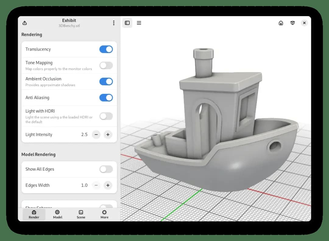 • Descripción: Es un software visor de modelos 3D para el escritorio GNOME basado en la biblioteca F3D, lo que le permite admitir muchos formatos de archivo, desde contenido digital hasta conjuntos de datos científicos, incluidos los formatos glTF, STL, STEP, PLY, OBJ, FBX, USD, Alembic y muchos más. Además, permite que se pueda arrastrar y soltar modelos 3D dentro de ella y se pueda exportar una imagen del modelo renderizado. También, permite cambiar muchas configuraciones como mapeo de tonos, oclusión ambiental, anti-aliasing, rugosidad del material, metalizado, color y opacidad para lograr el renderizado perfecto. Y también permite usar una imagen HDRI o un color personalizado como fondo de un diseño.