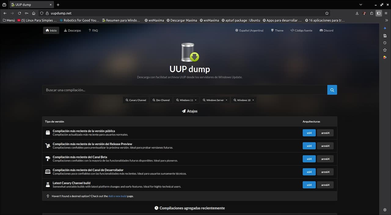 - Ir al sitio web oficial de UUP dump y descargar cualquier archivo UUP disponible, tanto haciendo clic sobre los enlaces de descargas en la ventana de Atajos de «Tipo de versión» o la de «Compilación».