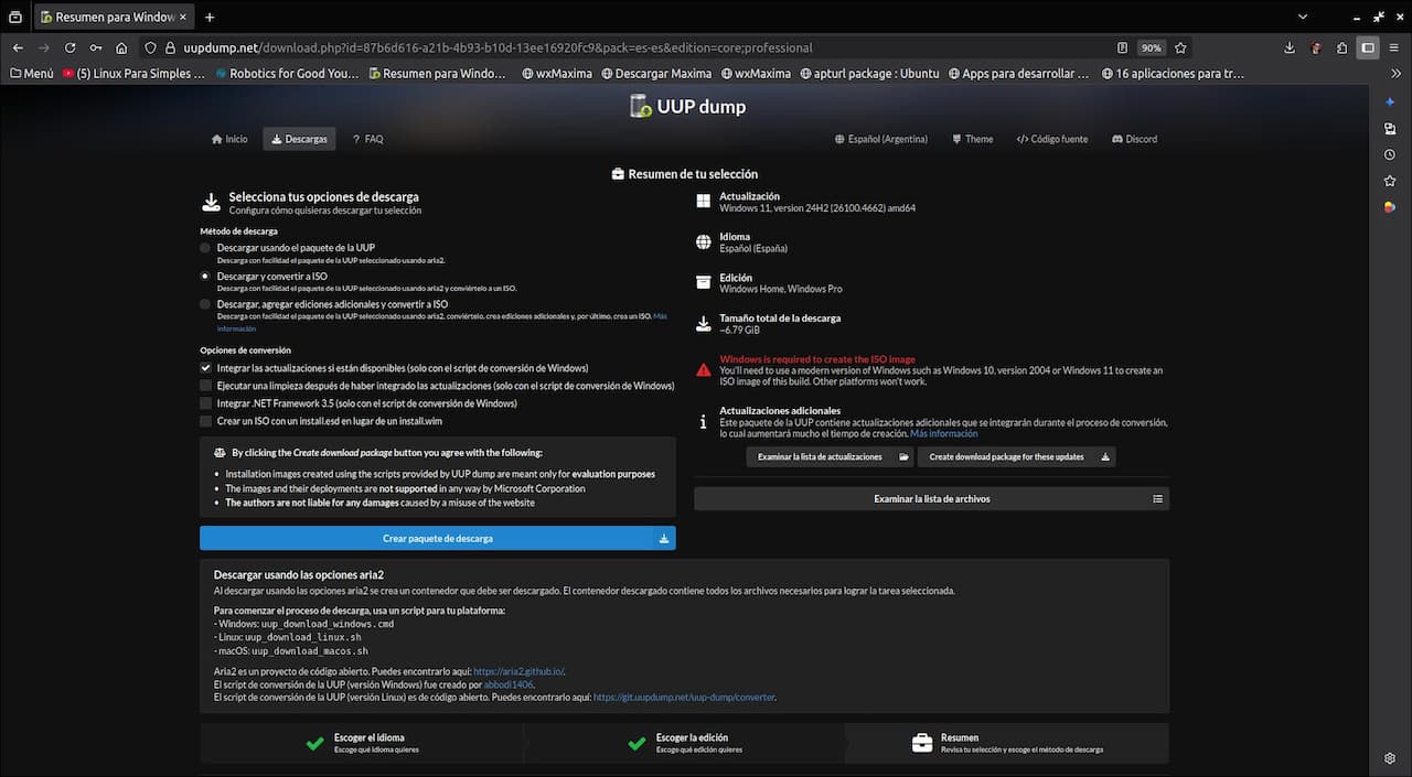 - Para finalizar esta primera etapa gráfica (GUI) deberemos seleccionar la opción «Descargar y convertir a ISO», y cualquier otra adicional que creamos conveniente en la sección «Opciones de conversión». Para luego, continuar presionando el botón «Crear paquete de descarga». Y ya culminado esta descarga, validamos la existencia de la misma en nuestro ordenador con Linux.