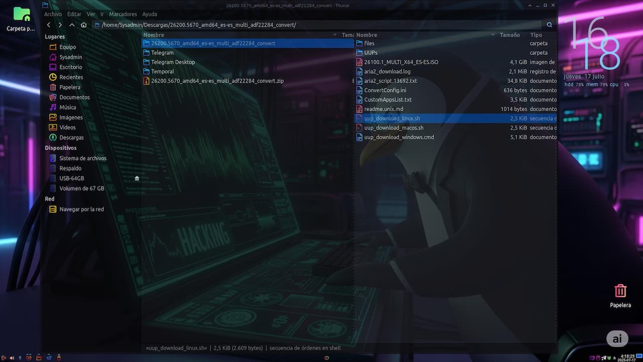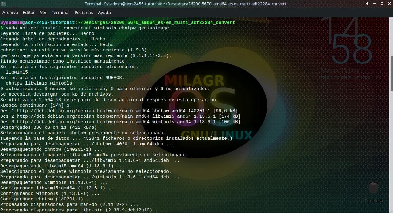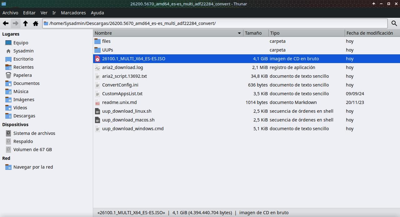 - Antes de iniciar esta parte es importante asegurarnos de que nuestra Distribución GNU/Linux usada tenga instalada los siguientes paquetes de software: cabextract, wimtools, chntpw, genisoimage y aria2. Ya luego, solo debemos ejecutar el programa «uup_download_linux.sh» ubicado dentro de la carpeta creada por la descompresión del archivo generado y descargado desde la web de UUP dump. Tal como se muestra a continuación hasta visualizar nuestra ISO generada.