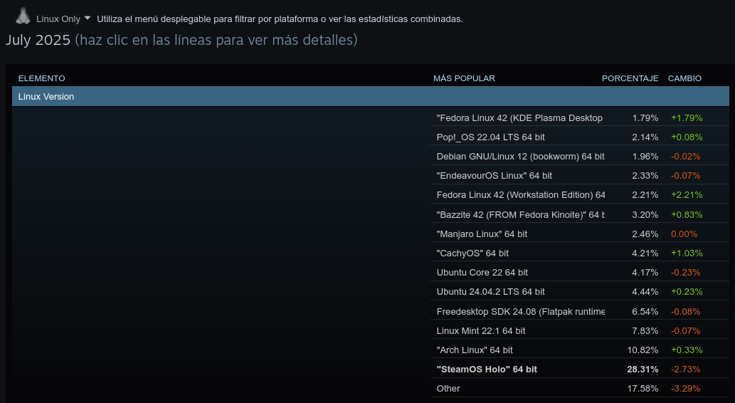 Como últimos datos relevantes tenemos la subida de un 1,03% por parte de CachyOS, un salto enorme que le ha permitido adelantar al Steam en formato Snap, y que SteamOS no ha parado de perder cuota con el paso de los meses si vemos que en junio de 2024 acaparaba el 41,17%. Con los datos de la propia encuesta de Steam, se puede concluir que el ascenso de Linux no se debe a SteamOS, sino a otros factores que están impulsando el uso de otras distribuciones.