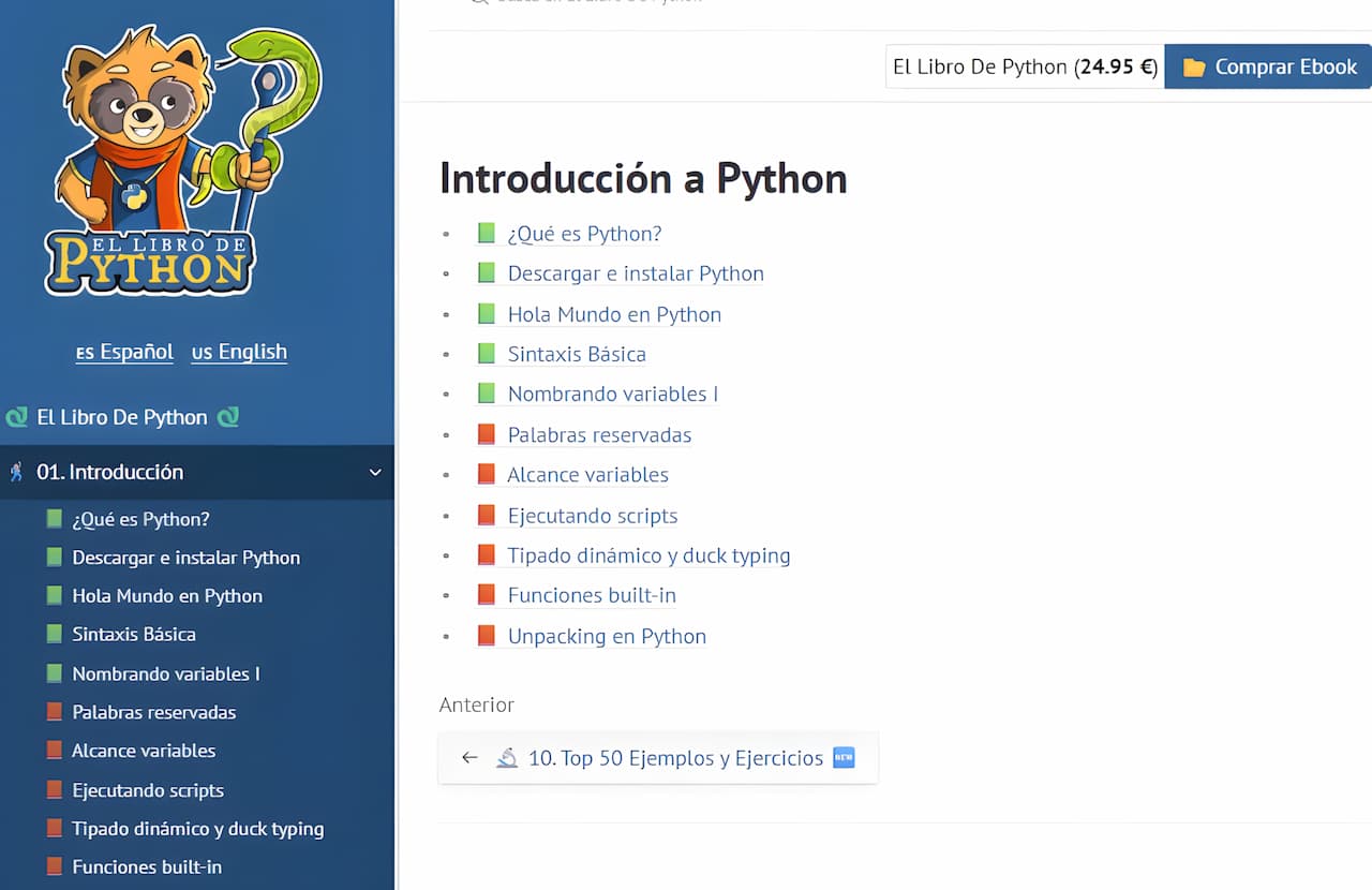 Tal y como hemos indicado antes, es un curso completamente gratuito. Pero si deseas acceder a capítulos exclusivos, que no están publicados en esta web, y a más ejemplos prácticos, siempre tienes la opción de hacerte con la versión Ebook desde la propia web por un precio de 24,95 euros. Aun así, debes saber que desde el apartado «Top 50 ejemplos y ejercicios», pondrás en práctica tareas de IA, análisis financiero, encriptación, desarrollo de juegos y mucho más.