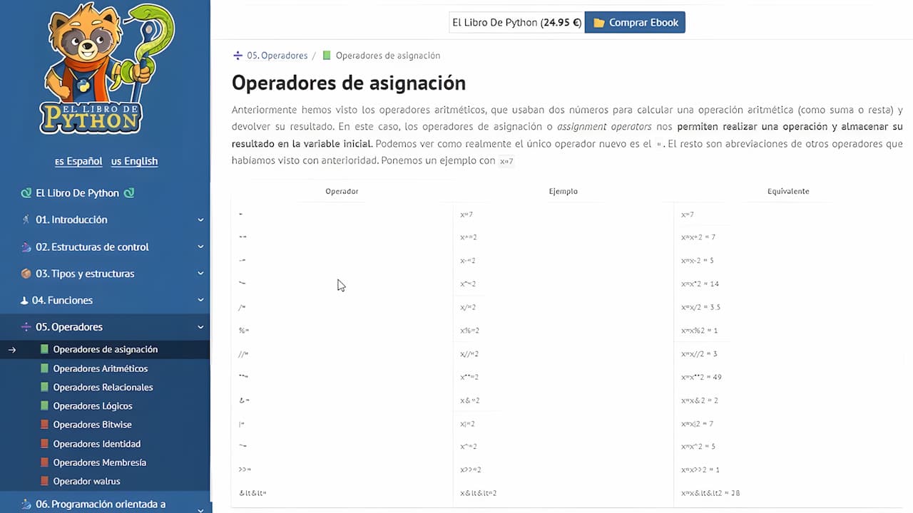 «Operadores», sección de instrucción de El Libro de Python. Foto: El Libro de Python